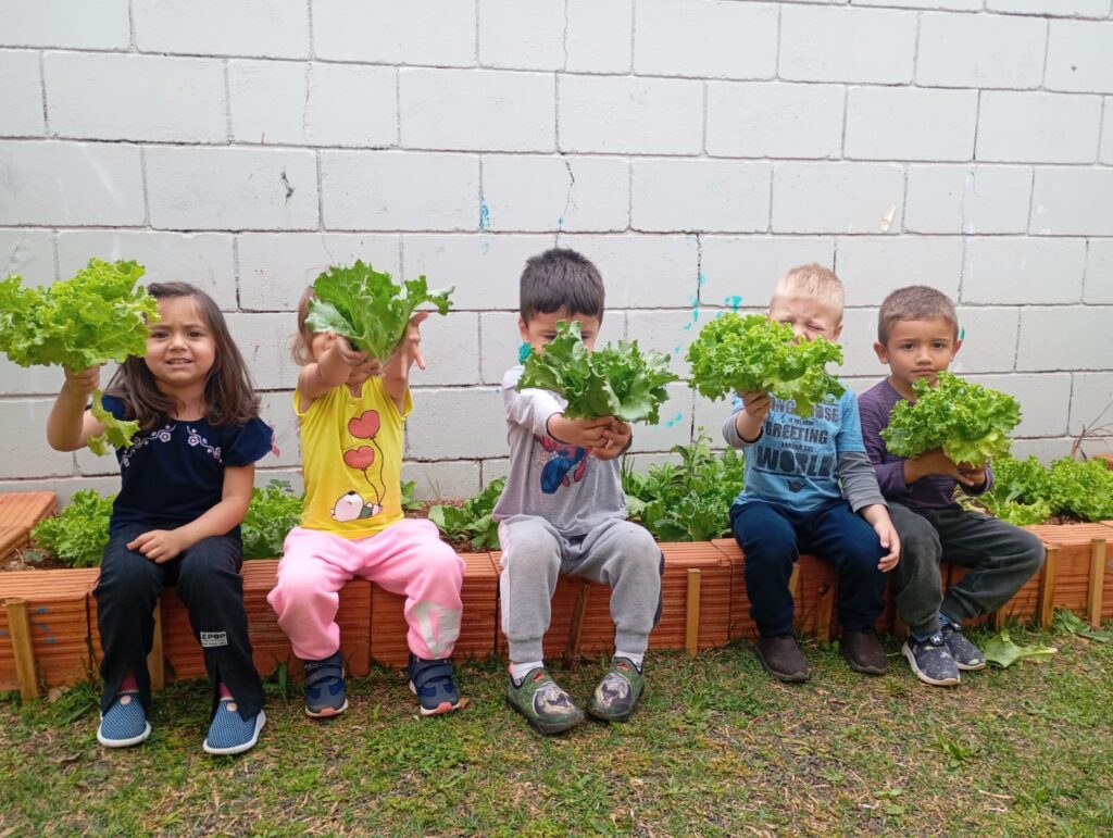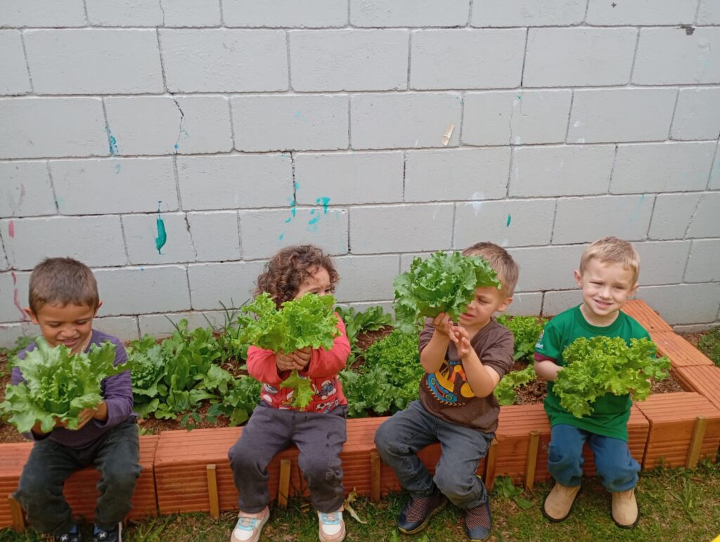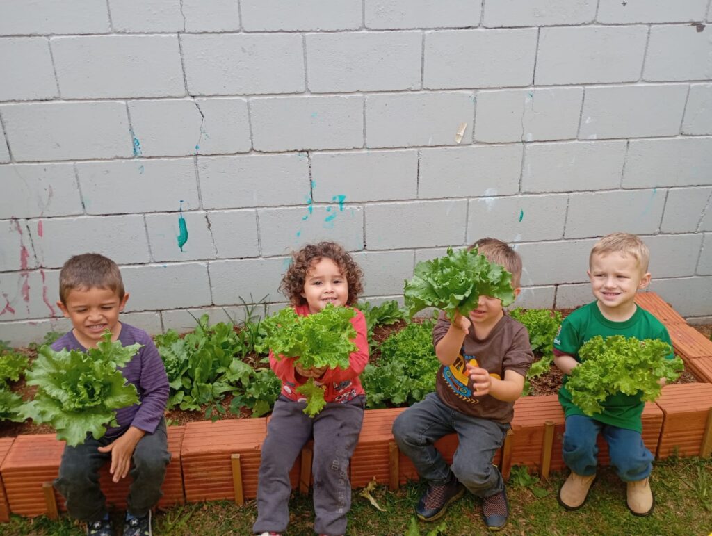Crianças do Cemei Criança Feliz colhem alfaces cultivadas no projeto “Alimentação Saudável”