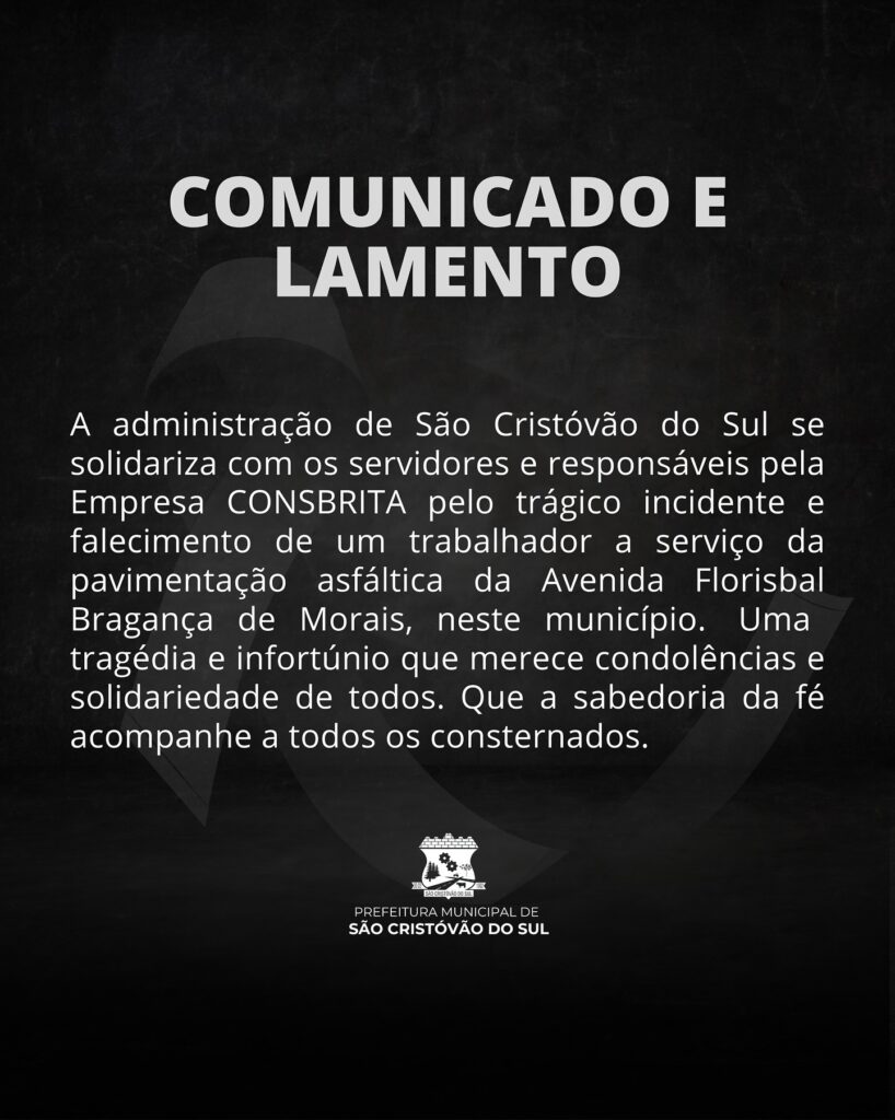 A administração de São Cristóvão do Sul se solidariza com os servidores e responsáveis pela Empresa CONSBRITA pelo trágico incidente e falecimento de um trabalhador a serviço da pavimentação asfáltica da Avenida Florisbal Bragança de Morais, neste município. Uma tragédia e infortúnio que merece condolências e solidariedade de todos. Que a sabedoria da fé acompanhe a todos os consternados.“