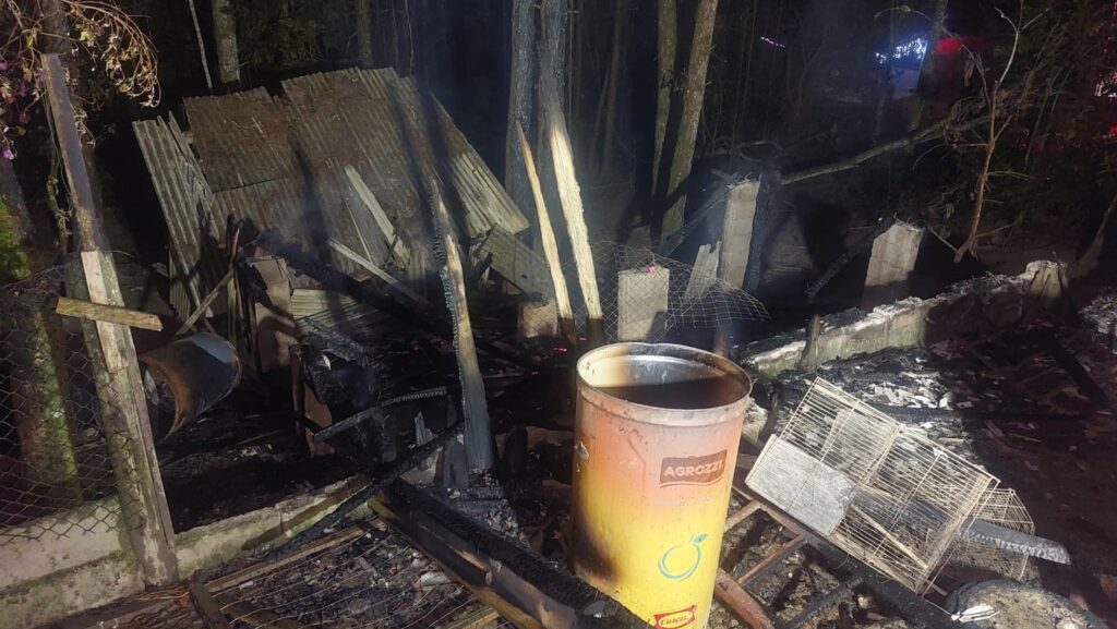 5 de dezembro de 2025As guarnições do Corpo de Bombeiros Militar de Blumenau foram acionadas na madrugada desta sexta-feira (05) para atender a um incêndio em uma pequena edificação de madeira, com cerca de 15 m², utilizada como galinheiro, na rua Laura Fernandes, no bairro Velha. Devido ao difícil acesso, apenas a equipe da AR 33 conseguiu alcançar inicialmente o local, encontrando a estrutura completamente tomada pelas chamas. Em seguida, outra equipe, utilizando uma pick-up equipada com conjunto de combate a incêndio adequado para áreas de mata e locais de difícil deslocamento, conseguiu apoiar a operação, permitindo que o fogo fosse controlado. Foram empregados sete bombeiros e utilizados aproximadamente mil litros de água, entre combate e rescaldo, que se estenderam por cerca de duas horas. A residência do proprietário, localizada próxima ao galinheiro, foi completamente preservada, e ninguém ficou ferido. Quanto aos animais, das quatro galinhas e doze pintinhos que estavam no local, sobreviveram as quatro galinhas e um pintinho. O proprietário recebeu orientações e a área permaneceu isolada para os trabalhos de perícia. Fotos da ocorrência foram registradas pela corporação.