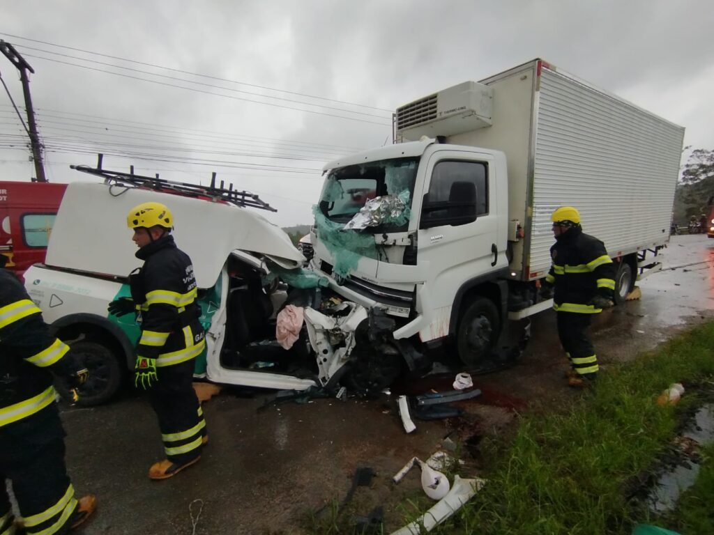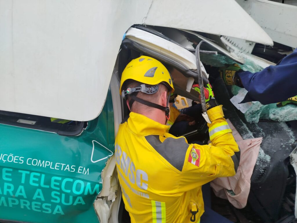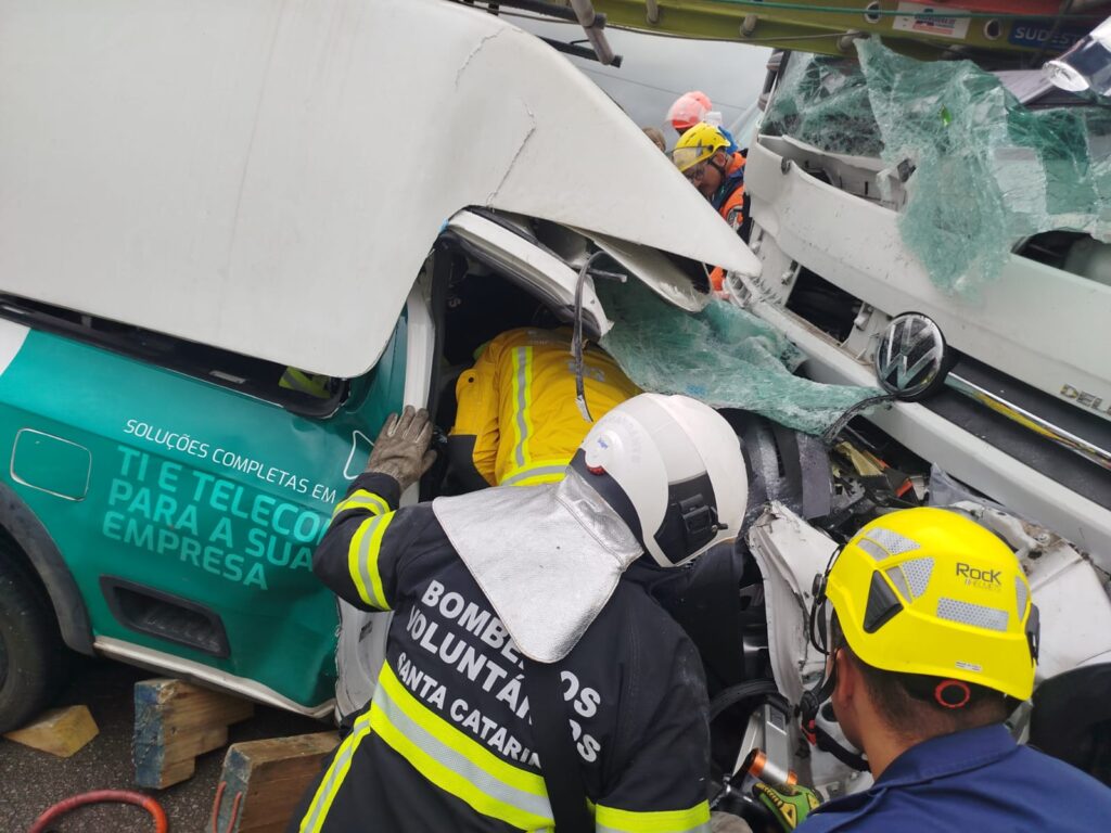10 de dezembro de 2025Uma colisão frontal entre um caminhão e um automóvel deixou um homem morto e outro gravemente ferido na tarde da última segunda-feira, por volta das 15h19, na Rodovia Jorge Lacerda. As equipes de resgate foram acionadas após a batida envolvendo um VW Saveiro e um caminhão VW Delivery, de Guaramirim. Quando os bombeiros chegaram, voluntários de Ilhota e a equipe aérea Arcanjo 03 já realizavam o primeiro atendimento. O motorista do caminhão, um homem de 32 anos, não resistiu aos ferimentos e morreu no local. Ele sofreu uma grave lesão na região da cabeça após ser atingido por uma escada que estava sobre a Saveiro e foi projetada durante o impacto. O condutor da Saveiro, de 37 anos, ficou preso dentro do veículo. As equipes realizaram a abertura das portas para possibilitar o acesso e a retirada segura do motorista. Ele apresentava fraturas nos membros inferiores e, depois de estabilizado, foi encaminhado ao Hospital Marieta pelo SAMU. A Polícia Militar assumiu o isolamento da área, enquanto o corpo da vítima fatal ficou aos cuidados da Polícia Científica para os procedimentos necessários.