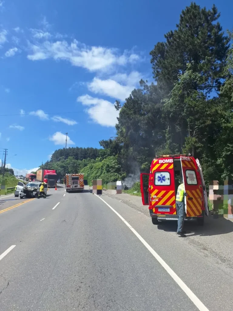 Um homem e uma criança morreram na manhã deste domingo (14) após um carro pegar fogo em um acidente grave na rodovia SC-418, no trecho conhecido como 27 curvas, em São Bento do Sul. A colisão frontal entre dois veículos foi registrada por volta das 9h29. De acordo com o Corpo de Bombeiros Militar (CBMSC), o acidente envolveu um Renault Kwid, que pegou fogo, e um Nissan Frontier. O motorista do Kwid foi encontrado morto dentro do veículo. Um menino de 11 anos que estava no carro apresentava traumatismo craniano encefálico e ausência total de sinais vitais. Uma jovem de 19 anos, também passageira do Kwid estava consciente e orientada. Ela apresentava inchaço no rosto, fratura, dores na perna e diversas escoriações pelo corpo. A vítima recebeu atendimento e foi conduzida com urgência para o Hospital e Maternidade Sagrada Família. Já o condutor do Nissan Frontier, de 60 anos, não se feriu e permaneceu no local. Foi realizada a extinção do incêndio, limpeza, sinalização da via e bloqueio do tráfego. A Polícia Militar, Polícia Rodoviária Estadual e Polícia Civil também atuaram durante a ocorrência. Informações sobre a identificação das vítimas não foram divulgadas.