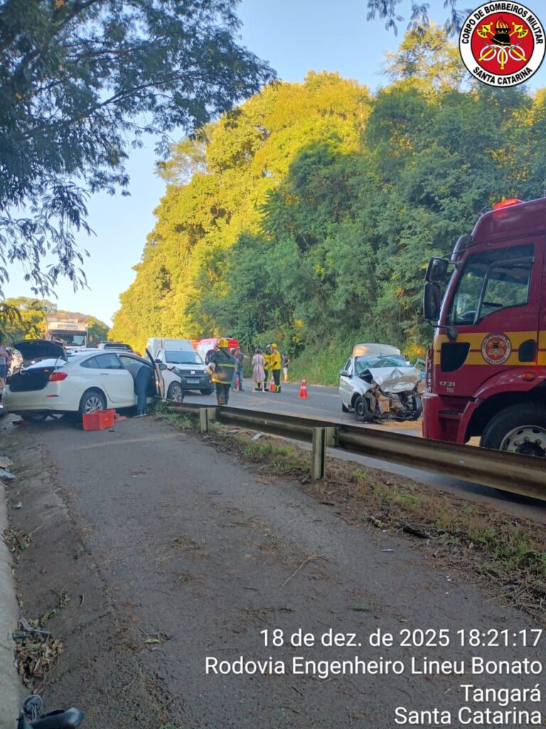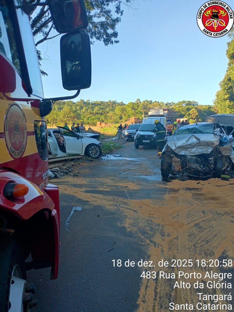 19 de dezembro de 2025Um grave acidente de trânsito foi registrado na tarde de ontem quinta-feira (18) na rodovia SC-135, nas proximidades da Capela de São Marcos, em Tangará. A ocorrência envolveu a colisão frontal entre dois veículos de passeio e resultou em uma morte no local, além de duas pessoas feridas. O Corpo de Bombeiros Militar de Tangará foi acionado por volta das 17h51 e, ao chegar ao local, confirmou a gravidade do acidente. Em um dos veículos, um Chevrolet Cruze, estava uma mulher de 40 anos, que apresentava um ferimento na perna direita. Ela recebeu os primeiros atendimentos e foi encaminhada ao Hospital Divino Salvador, em Videira, pela equipe do SAMU. No outro automóvel, um Fiat Siena, o condutor foi encontrado preso às ferragens, com múltiplos ferimentos e sem sinais vitais, tendo o óbito sido constatado no local. Ainda no mesmo veículo estava um passageiro de 34 anos, localizado sobre a via, consciente e orientado, mas com suspeita de hemorragia interna. Ele foi atendido pelos bombeiros e levado ao Hospital Divino Salvador para avaliação médica. Além do Corpo de Bombeiros, atuaram na ocorrência a Polícia Rodoviária Estadual, a Polícia Militar de Tangará, a Polícia Civil e a Polícia Científica, que assumiram os procedimentos legais e a apuração das circunstâncias do acidente.