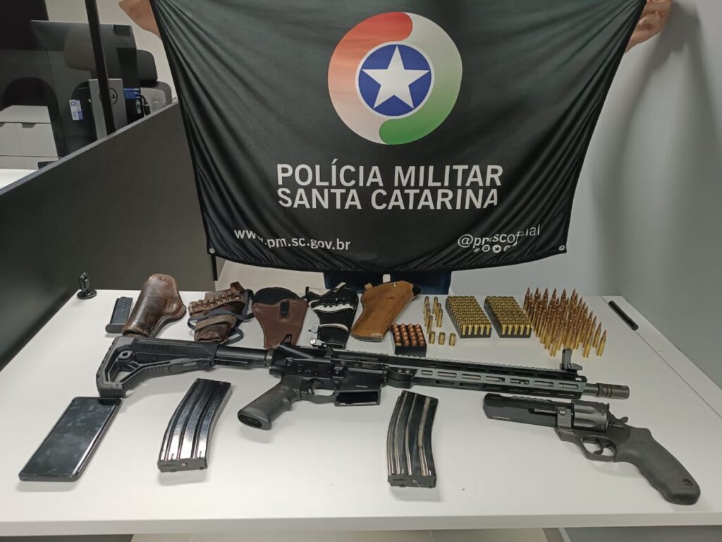 22 de dezembro de 2025Um homem de 46 anos foi preso na noite de ontem domingo (21), em Xanxerê, após se envolver em uma ocorrência de violência doméstica, ameaças e posse irregular de armas e munições. A ação foi atendida pela Polícia Militar de Santa Catarina, por meio do 30º Batalhão de Polícia Militar. A ocorrência foi registrada por volta das 20h40, na Rua Humberto Vancini, bairro Leandro. A guarnição foi acionada via COPOM e, ao chegar ao local, realizou contato com as partes envolvidas. Durante a averiguação, os policiais localizaram o autor trancado no quarto do casal, sendo que ele saiu do cômodo após ordem verbal, sem oferecer resistência. Conforme apurado no local, o homem apresentava sinais de embriaguez e teria proferido ameaças de morte e diversas ofensas verbais na presença dos filhos, além de tentar agredir um deles. Ainda de acordo com os levantamentos, o autor se apoderou de uma arma de fogo e passou a acionar o gatilho repetidas vezes, com o objetivo de intimidar os familiares. Também houve o registro de episódios anteriores de violência doméstica, sendo solicitadas medidas protetivas de urgência. Durante a ação, a Polícia Militar apreendeu um fuzil calibre 5,56 mm, um revólver calibre .357, carregadores, mais de 100 munições de diversos calibres, coldres e estojos de munições deflagradas. O homem foi conduzido à Delegacia de Polícia Civil para os procedimentos legais cabíveis. As vítimas também foram encaminhadas à delegacia para registro e demais providências.
