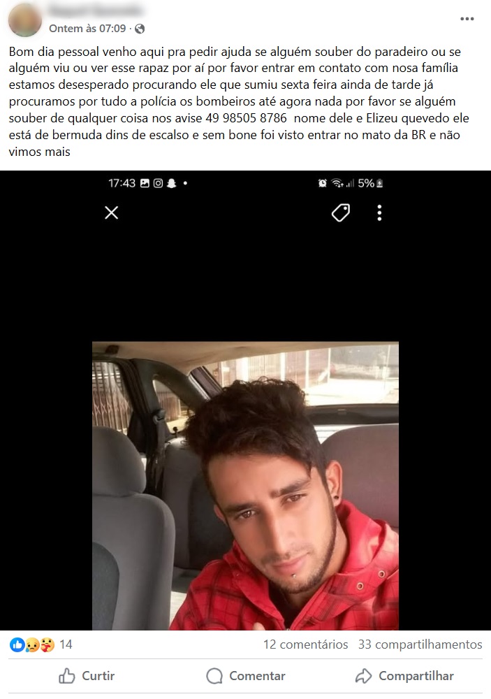 A morte de um homem que teve o corpo encontrado no rio São José, em Chapecó, pode ter ocorrido de forma acidental, possivelmente em decorrência de uma queda de altura, conforme informações repassadas pelas forças de segurança. O corpo foi localizado na manhã de ontem segunda-feira, dia 29, no bairro Quedas do Palmital. A vítima foi identificada como Elizeu Quevedo, de 32 anos, natural e morador de Chapecó. O homem estava desaparecido desde a última sexta-feira, dia 26, quando familiares chegaram a divulgar pedidos de ajuda nas redes sociais para localizá-lo (veja abaixo).