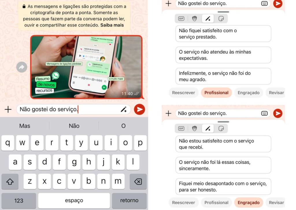 Um novo recurso do WhatsApp utiliza a Inteligência Artificial (IA) da Meta para melhorar o texto digitado nas mensagens. Para utilizar, é necessário estar com o aplicativo atualizado no celular e em seguida, entrar em uma conversa para enviar uma mensagem. Ao lado, há um ícone de lápis com estrela, que quando clicado, sugere melhorias para o texto digitado em diferentes estilos, como profissional e engraçado. Além do ajuste no tom, há a opção de reescrever a frase. O objetivo, conforme o aplicativo de mensagens, é tornar a comunicação mais clara, educada ou profissional com apenas um toque.