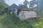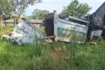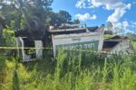 Caminhão de coleta de lixo sai da pista e capota na SC-161 em Romelândia; veja as imagens