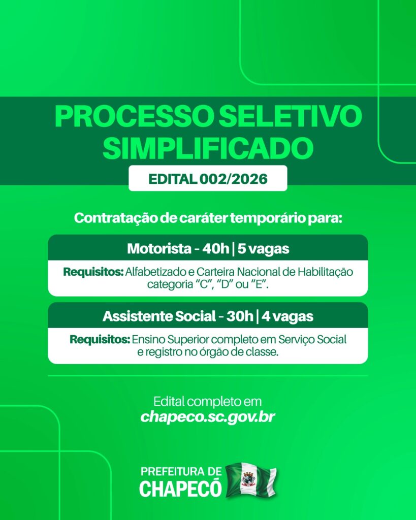 21 de janeiro de 2026Está aberto o edital 002/2026 de Processo Seletivo com vagas para motorista e assistente social para a Prefeitura de Chapecó. As inscrições iniciam nesta quarta-feira (21) e encerram no dia 09 de fevereiro. Os interessados devem acessar o site da Prefeitura de Chapecó e conferir o edital e as informações complementares para cada função. O valor da inscrição é R$80 (motorista) e R$120 (assistente social).