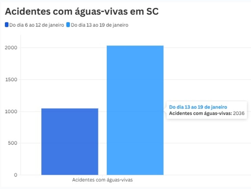 Os números de acidentes com águas-vivas quase dobraram na última semana em Santa Catarina em comparação com a semana anterior. Os dados da Estação Verão 2025/2026, divulgados pelo Corpo de Bombeiros Militar, revelam que entre os dias 13 e 19 de janeiro foram 2.036 acidentes, um aumento de 94% em relação ao período anterior, equivalente aos primeiros dias do ano, quando foram 1.047 acidentes com águas-vivas. Os números do período mais recente representam quase 300 acidentes com águas vivas por dia durante a semana: ao todo, foram 291 acidentes, em média. As águas-vivas possuem uma aparência que lembram uma gelatina incolor, ou de coloração arroxeada e possuem tentáculos. Quando entram em contato com a pele humana, esses animais produzem uma forte sensação de queimadura. Desde o último verão, o Corpo de Bombeiros utiliza bandeiras nas praias para sinalizar a presença destes animais marinhos. As bandeiras são da cor lilás, padrão internacional de cor que indica a presença de animais perigosos nas praias. As bandeiras estão distribuídas em todo o Litoral catarinense e não substituem as bandeiras já usadas para indicar as condições do mar.