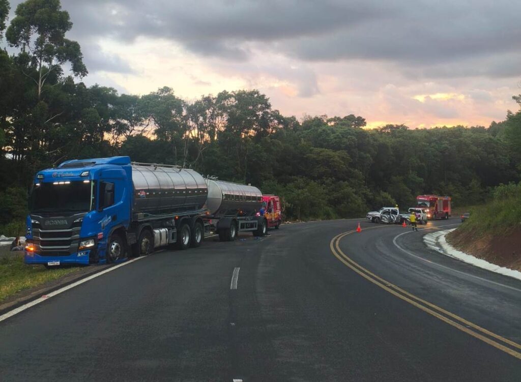 Uma caminhonete e uma carreta se envolveram em uma colisão na noite de ontem sábado, dia 31, na BR-282, em Vargem Bonita, no Oeste catarinense. O acidente pouco antes das 19 horas não deixou feridos. A batida foi entre uma carreta Scania, dirigida por um homem que não sofreu ferimentos, e uma caminhonete Volkswagen Amarok, com placas da Argentina. Na caminhonete estavam quatro ocupantes. O condutor, de 67 anos, relatou não ter se ferido e recusou atendimento. A esposa dele, passageira do veículo, assinou termo de recusa por si e como responsável por uma criança de 3 anos, que estava na cadeirinha e também não se machucou. Uma quarta ocupante, de 40 anos, também recusou atendimento. O atendimento da ocorrência foi realizado por equipes do Corpo de Bombeiros de Catanduvas, com apoio do Corpo de Bombeiros Voluntários de Irani. A Polícia Rodoviária Federal também foi acionada para os levantamentos das causas.