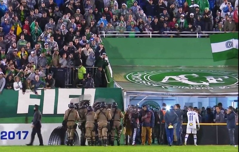 “Ao sair do campo, escoltados pela polícia, uma pedra foi arremessada da arquibancada onde se situava a torcida da Chapecoense atravessou os escudos de proteção atingindo o quarto árbitro, sr. Evandro Tiago Bender, no rosto (supercílio e abaixo do olho) causando ferimento nas duas regiões. Este fato foi registrado no boletim de ocorrência com número de protocolo 2828191, feito no vestiário pelo policiamento local. O exame de corpo de delito será anexado assim que realizado. Cabe relatar que ainda dentro de campo e protegidos pela polícia, identificamos uma confusão generalizada na zona mista, contudo, devido a nossa posição no campo, não foi possível identificar o que iniciou tal incidente e os infratores envolvido”.