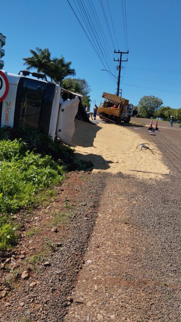 Caminhão capota e colide com carro na SC-283 em São Carlos