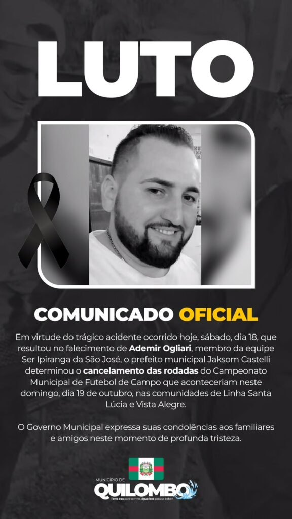 Um homem de 35 anos morreu após capotar o quadriciclo que conduzia no final da tarde de ontem sábado, dia 18, na Linha São Ricardo, no interior do município de Quilombo, no Oeste catarinense. O Corpo de Bombeiros foi acionado para atender a ocorrência por volta das 18 horas, mas a vítima já estava em óbito no local. O homem foi identificado como Ademir Ogliari, morador de Quilombo. Após a morte, a prefeitura divulgou uma nota de pesar e inclusive o cancelamento de eventos esportivos que aconteceriam no município na tarde deste domingo, dia 19. Muitas mensagens de lamento à tragédia foram publicadas por amigos e familiares nas redes sociais. “Descansa em paz Ademir Ogliari, que Deus console o coração de todos”, diz uma delas. O corpo é velado na linha São José, no interior de Quilombo. Uma celebração religiosa está prevista para as 17h30 deste domingo, com o sepultamento logo em seguida, no cemitério da comunidade.